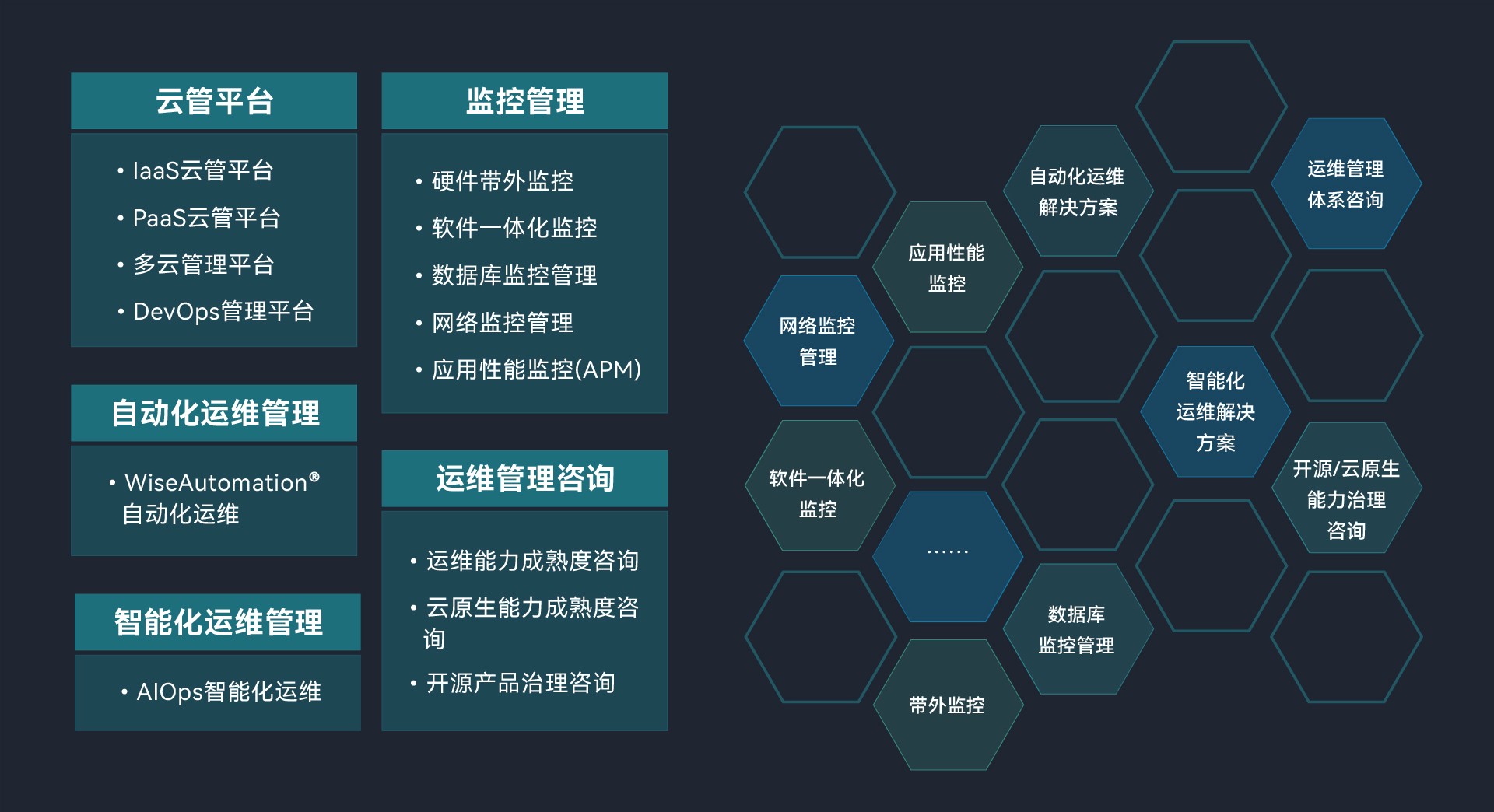 开云体育-开云(中国)一站式服务官方网站 在运维管理产品领域提供硬件、软件监控、自动化运维、智能化运维和安全管理等产品解决方案,帮助客户实现对基础设施、应用程序和服务的全方位监控、反馈和管理。同时,开云体育-开云(中国)一站式服务官方网站 在运维支撑平台领域提供云、大数据和智能平台中台解决方案,为客户打造基础设施管理平台,确保客户在各类运维需求下,都能够得到充分的支撑和保障。